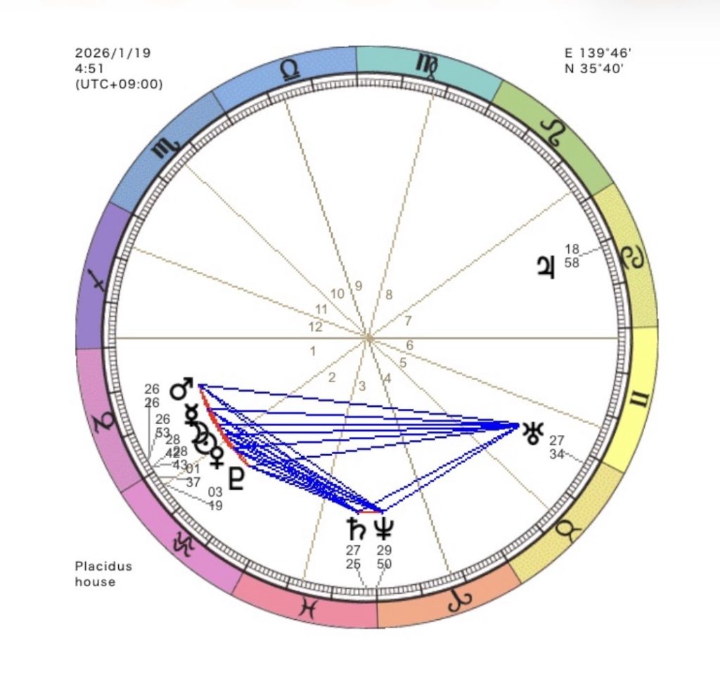 🔵土星と海王星のサポート: 「土台を固める土星」と「理想を描く海王星」が、新月の意志を支えています。そのため単なる幻想で終わらせず、「理想をどうやって現実的な形に落とし込むか」という長期的な土台作りがスムーズに進みます。